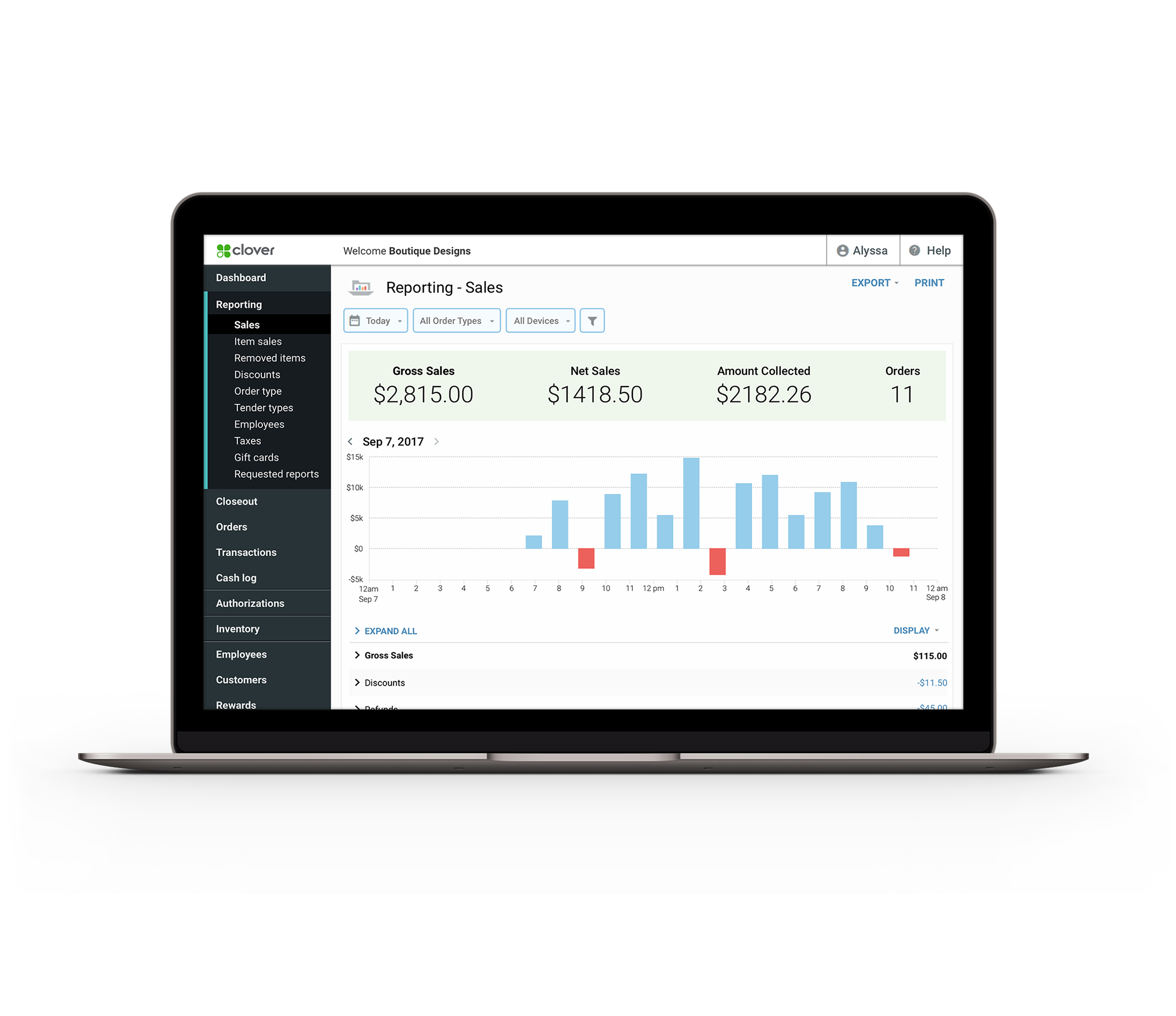 At-a-glance performance insight Identify the best and worst performing items, locations, times, and team members with Clover’s sales tracking system.